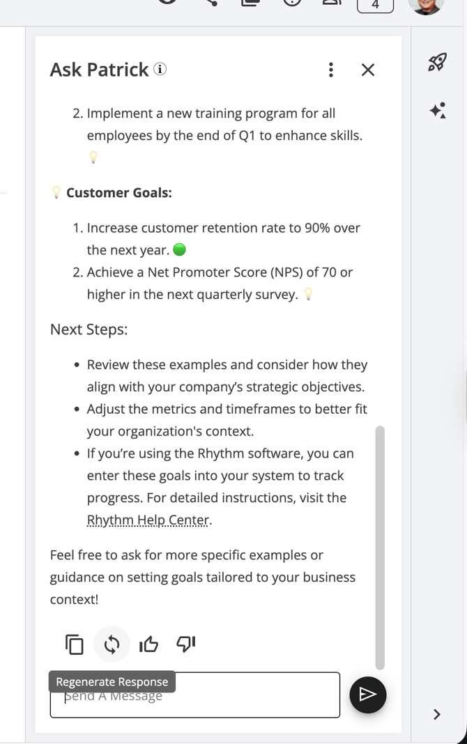 Rhythm Intelligence powers Ask Patrick. We partnered with OpenAI to build this feature. Based on their underlying technology, we customized our chat experience and prompted our coach with our methodology, books, and blogs so it can respond based on our decades of experience and patterns.