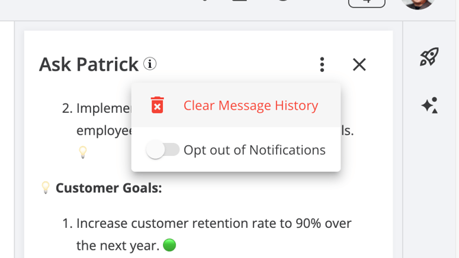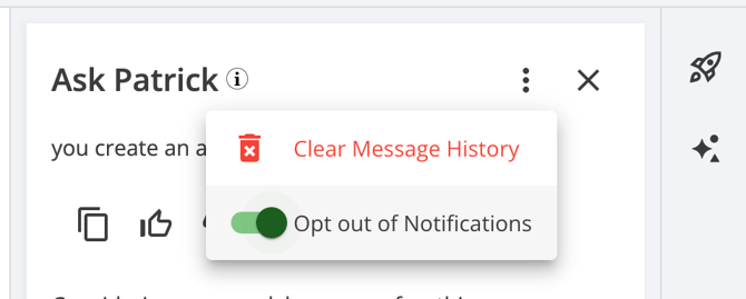 If you'd prefer not to receive any notifications, you can always opt out by clicking the More Actions icon in the Ask Patrick window and toggling to Opt out of Notifications: