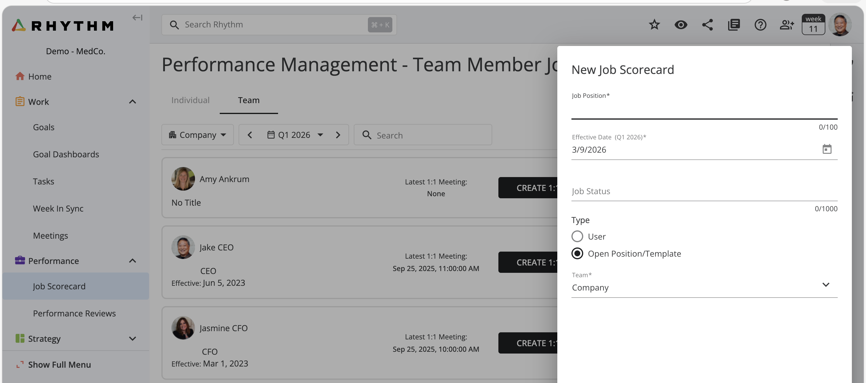 Note: You can click the + on the Performance screen to create a new Job Scorecard for an Open Position if you are in the process of hiring for a new role.
