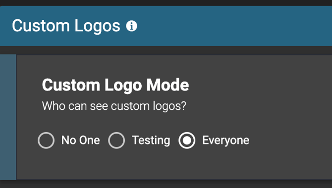 - Only Admins will be able to see the logo in "Testing" mode so you can make sure everything looks good. When you are ready to launch your custom logos, toggle to "Everyone"