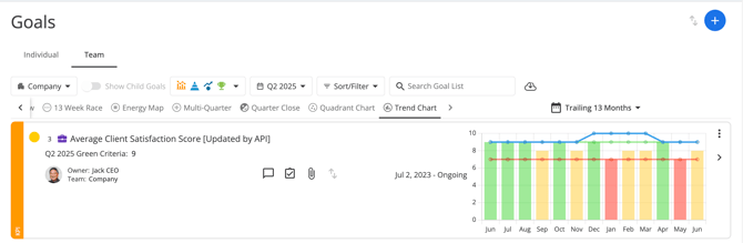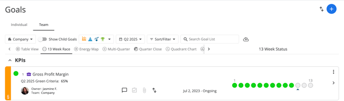 We've given you the flexibility to view different information about your goals in the list so you can have what you need at your fingertips whether you are preparing for a weekly meeting, analyzing trends in your financial KPIs over time, or trying to decide which priorities are most important to tackle this quarter.
