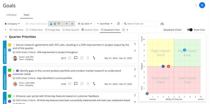 - Quadrant Chart: plot goals on Impact and Ability to Execute